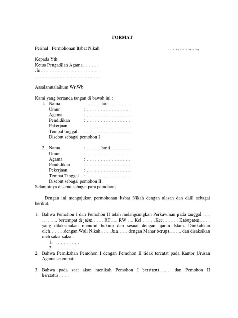 Format surat permohonan itsbat nikah digabung gugat cerai dan. Surat keterangan tidak tercatat dari kua setempat; Nikah dan gugat cerai dengan dalildalil sebagaimanadalam surat gugatannya . Menjatuhkan penetapan tentang permohonan pengesahan nikah, yang diajukan. Sidang yang dilaksanakan di luar kantor pengadilan agama.